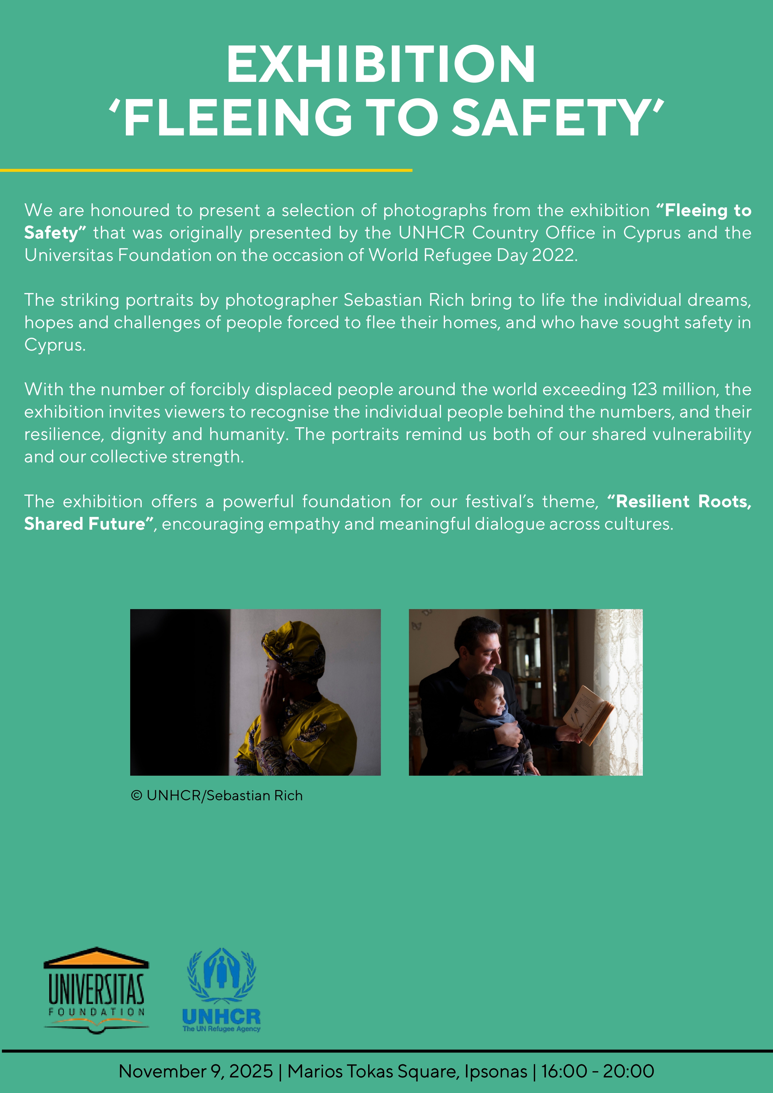 As part of the 2nd Intercultural Festival of the Municipality of Kourion, which will take place on Sunday, November 9, 2025, at Marios Tokas Square in the Municipal District of Ypsonas, under the theme “Resilient Roots, Shared Future”, the Universitas Foundation and the United Nations High Commissioner for Refugees (UNHCR) in Cyprus will present the photographic exhibition by Sebastian Rich, entitled “Fleeing to Safety”, curated by Katerina Hadjistylli.
