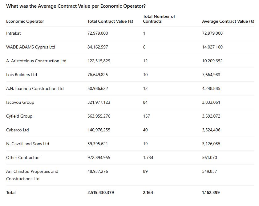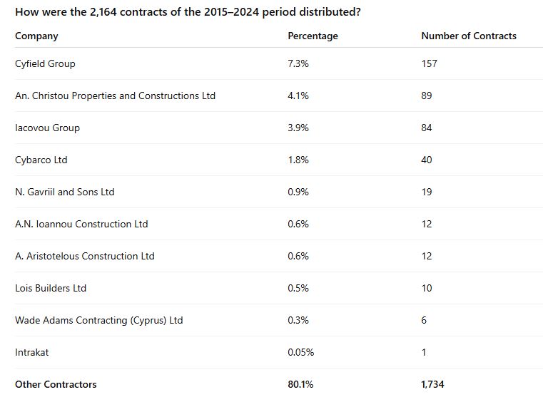 According to data extracted from the electronic public procurement system (eProcurement), while a total of 2,164 public contracts were awarded during that period, a significant share of their total value was concentrated among just three construction groups: Cyfield, Iacovou, and Cybarco.