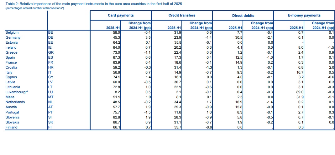Card payments accounted for 57 percent of the total number of non cash payments in the eurozone during the first half of 2025. Credit transfers represented 22 percent, direct debits 14 percent, and electronic money payments 6 percent.