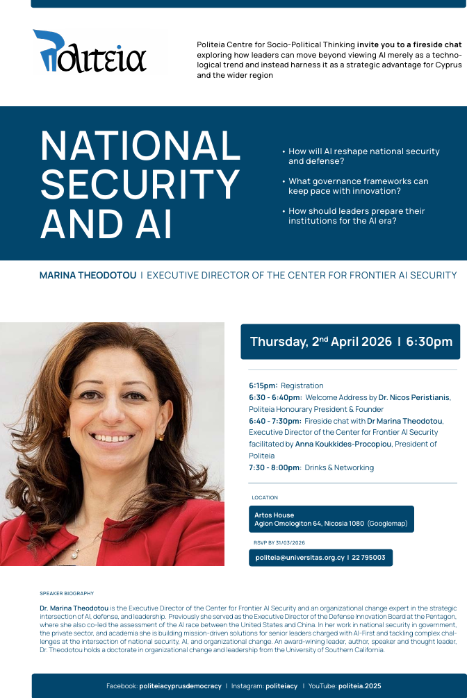 The Politeia Centre for Socio-Political Thinking is organising a public discussion on the growing impact of artificial intelligence on national security, strategic planning and leadership. The event will take place on Thursday, April 2, at 18:30 at Artos House in Nicosia and is open to the public.