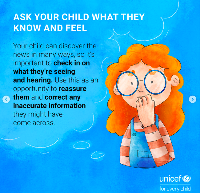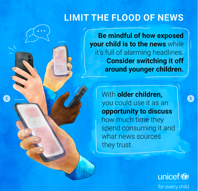 UNICEF advises parents to be mindful of how much news children consume and to consider switching off television broadcasts or notifications when younger children are present.