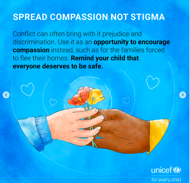 UNICEF advises parents to emphasise compassion and human solidarity, reminding children that everyone deserves safety.