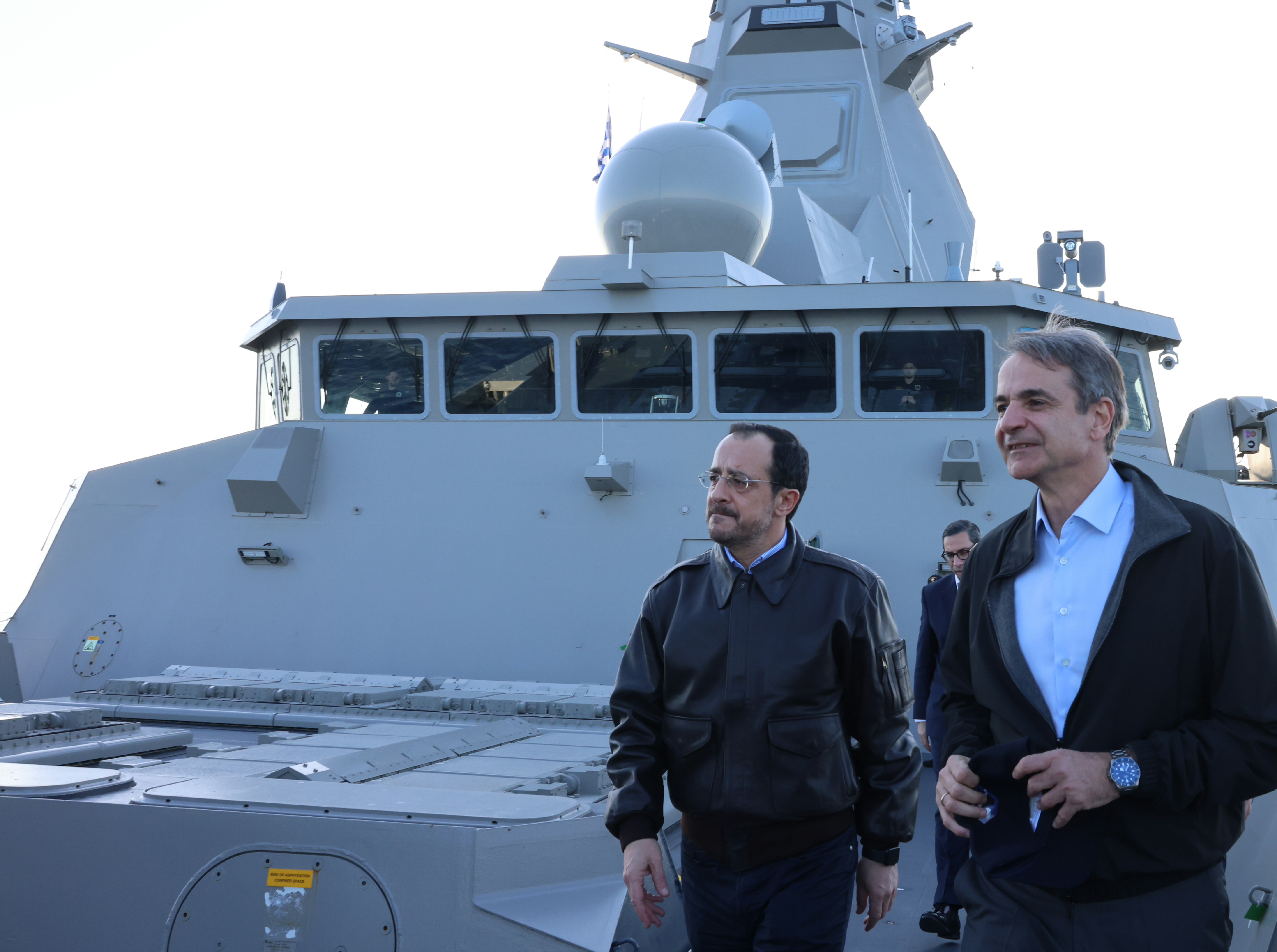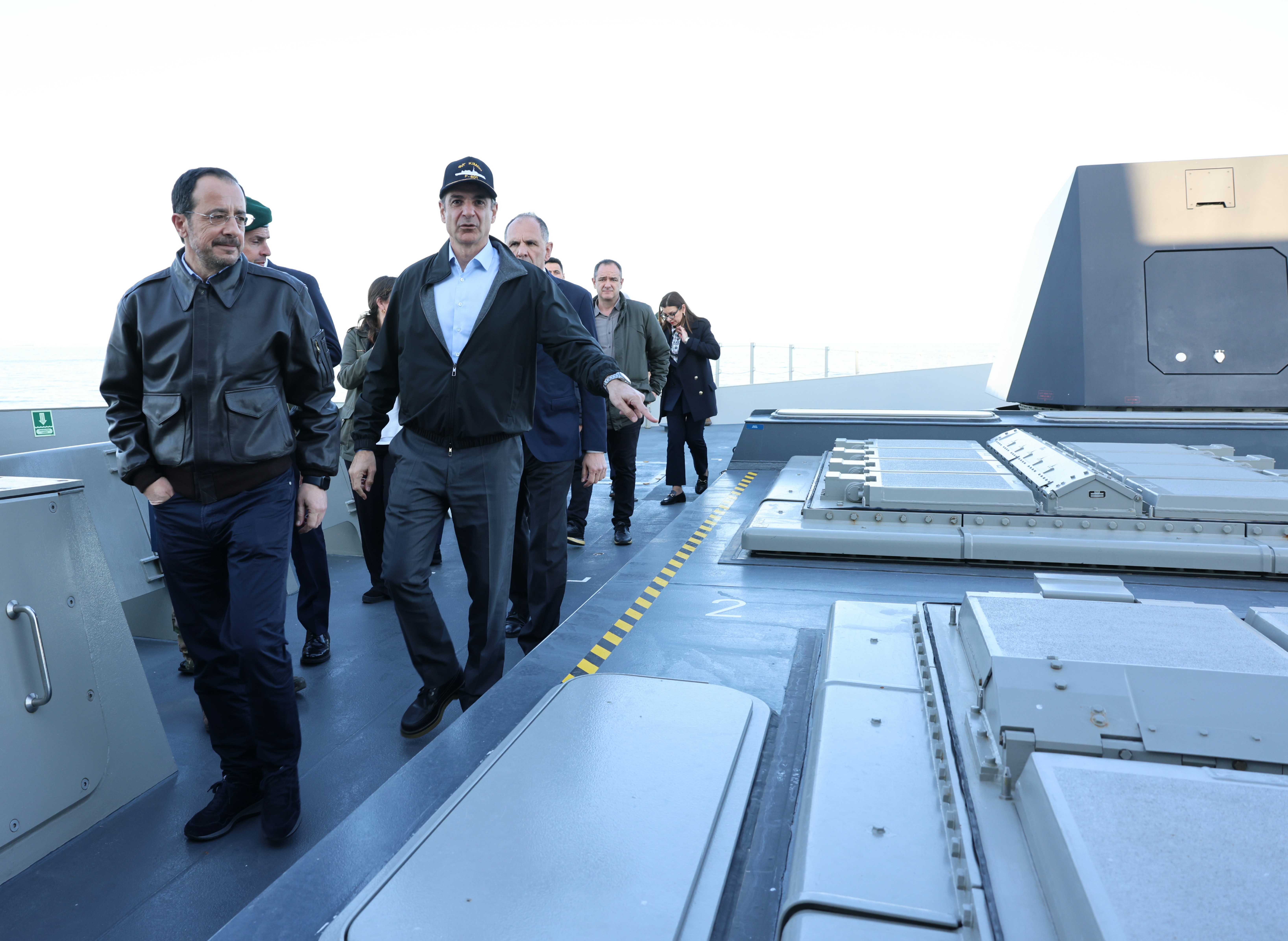 Mitsotakis and Christodoulides visited the frigate accompanied by Cyprus Defence Minister Vasilis Palmas and Greek Foreign Affairs Minister George Gerapetritis. The Greek prime minister thanked the crews of the two Greek frigates deployed in the region, praising their readiness to undertake what he described as an important mission.