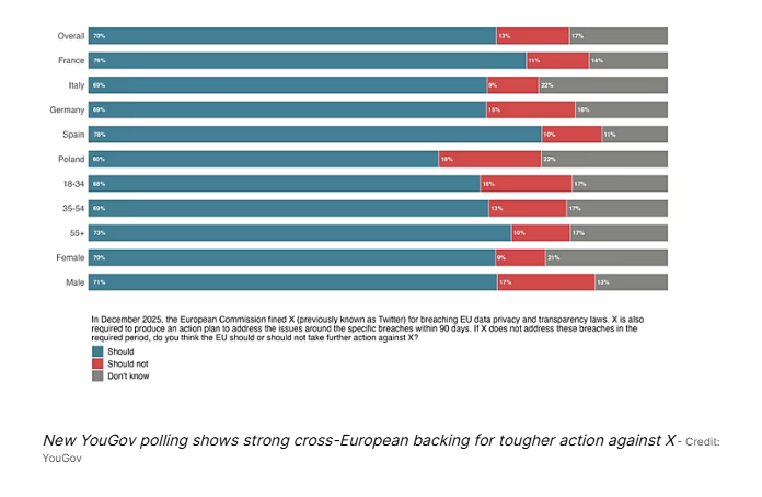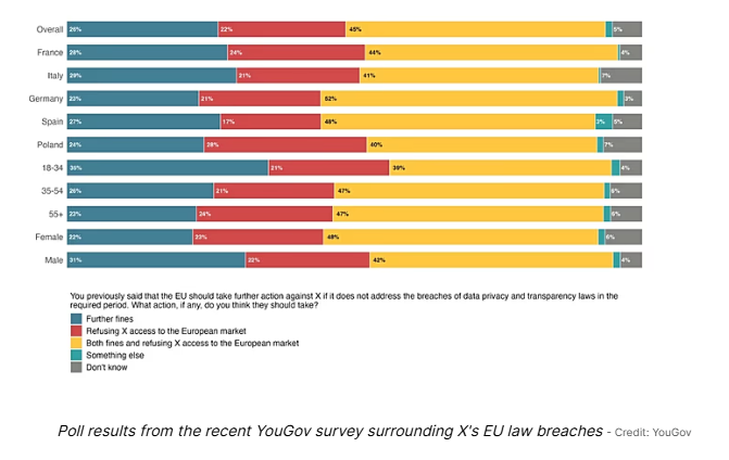 According to the YouGov data, 70 percent of respondents would support repercussions if X fails to respond adequately to the Commission’s fine.