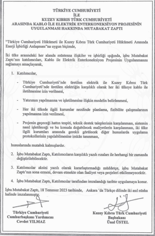 The memorandum of understanding on electricity, signed in Ankara on July 18, 2023 by Üstel and Cevdet Yılmaz, was published in the so called official gazette of the occupied areas.