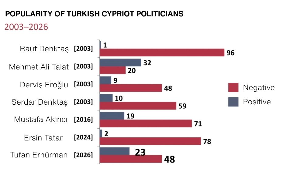However, the pro-reunification leader and former sparring partner of Nikos Anastasiades, Mustafa Akıncı, came third, with a 71% negative rating (and only 19% positive). Son of Rauf, Serdar Denktaş, had a 59% negative rating (10% positive), while incumbent Turkish Cypriot leader Tufan Erhürman came fifth with a 48% negative rating (23% positive) along with Derviş Eroğlu on 48% negative rating (but only 9% positive). The least unpopular and most popular Turkish Cypriot politician on the list with a 20% negative rating and 32% positive, was Mehmet Ali Talat.
