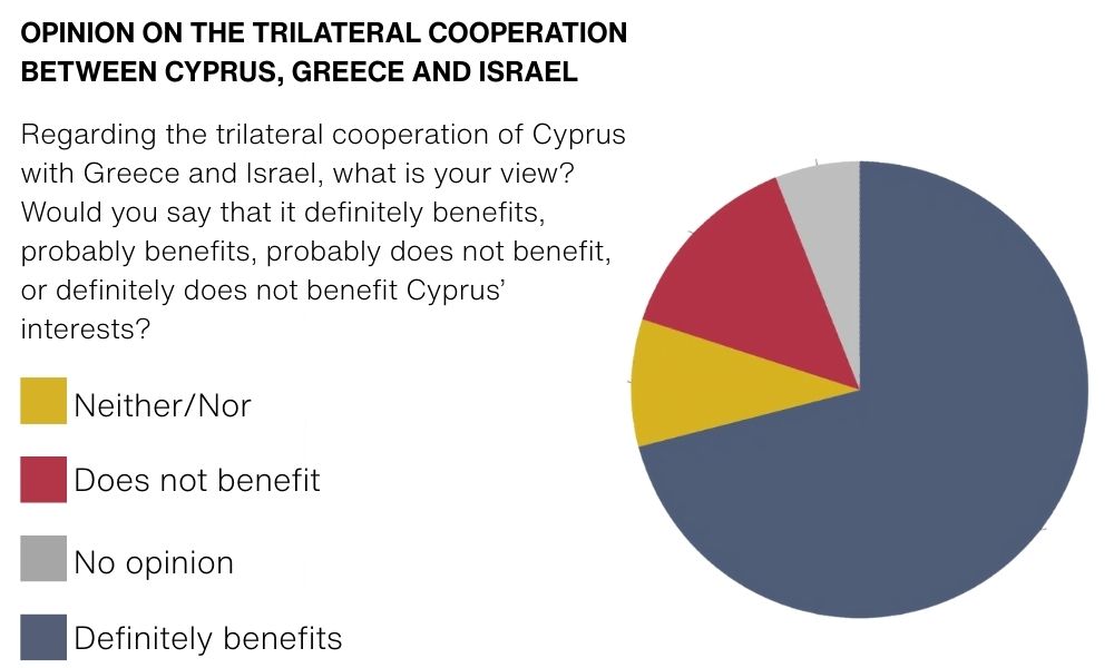 Israel’s rising popularity in Cyprus was also reflected in a question on the Cyprus-Greece-Israel trilateral cooperation, with 71% seeing it as ‘beneficial’ to Cyprus’ interests, compared to 14% who say it is ‘not beneficial’, 9% who say it ‘neither beneficial nor not beneficial’ and 6% with ‘no opinion’.