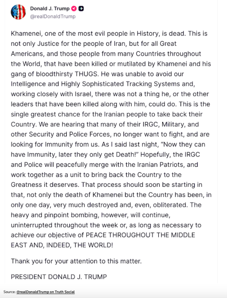 Trump described Khamenei as “one of the most evil men in history” and stated that his death represents justice not only for the Iranian people but also for Americans and others around the world who, he argued, had suffered because of Khamenei and what he called his “bloodthirsty gang”.