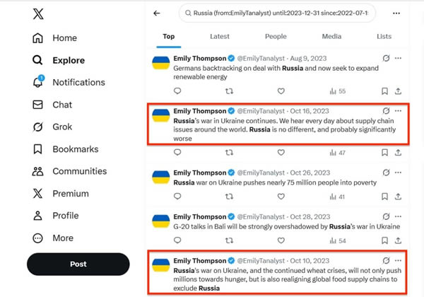 This raises the question as to why an ‘independent analyst’, writing two to four ‘original’ articles a month – and with a limited following of only 300+ followers on ‘X’ on the day the video was leaked – promoted only three of her articles all year?
