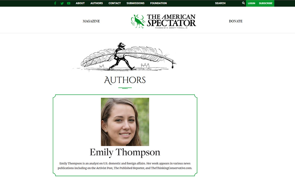Politis could find no articles of ‘Emily Thompson’ on the Activist Post or The Published Reporter. However, two more articles were found on The American Spectator, with the same profile photo and description as The Thinking Conservative.