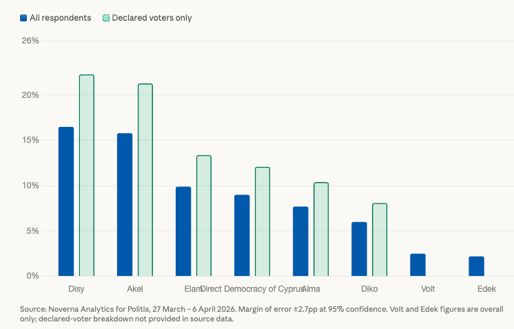Among all respondents, Disy leads with 16.5%, narrowly ahead of Akel at 15.8%. The gap between the two falls within the survey's margin of statistical error of plus or minus 2.7 percentage points, confirming the continued balance of power between the island's two dominant parties. Elam comes third with 9.9%, consolidating its position as a near double-digit force. Direct Democracy of Cyprus follows closely at 9.0%, placing it within striking distance of Elam for third place and establishing it as one of the main vehicles for anti-establishment sentiment. Alma records 7.7%, also showing notable momentum, while Diko stands at around 6.0%, reflecting continued decline from previous elections. Further back, Volt registers 2.5% and Edek 2.2%, both within range of the 3.6% parliamentary threshold. Smaller formations remain at marginal levels.