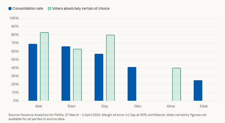 The data on voter consolidation reveals important differences in the internal cohesion of each party. Akel shows the highest consolidation rate at 69%, indicating a firm and loyal core vote. Elam follows at 66%, while Disy sits at 57%. At the other end of the scale, Diko records a consolidation rate of just 41%, which partly explains its polling decline, and Edek stands at only 25%, a figure that points to serious voter leakage. The trend over time shows Akel's consolidation edging up, Elam's rising notably in April, and Disy recovering after a slight earlier dip, while Diko has seen a meaningful fall.