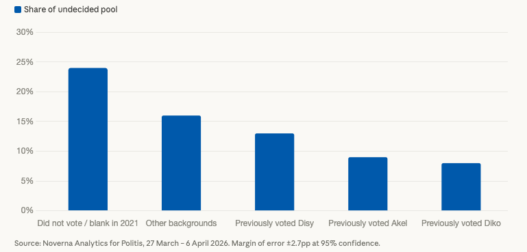 The most consequential finding in the survey is the 21.8% of respondents who are undecided or say they will not vote, alongside a further 3.1% who declined to answer. Combined, this pool of roughly 25% of the electorate exceeds the individual share of any single party, and its eventual movement, in any direction, could fundamentally alter the parliamentary arithmetic.