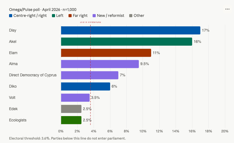 On voting intentions, Disy leads with 17%, followed closely by Akel on 16%. Elam comes third on 11%. Alma, the reformist movement founded by former Auditor General Odysseas Michaelides, places fourth with 9.5%, an increase of 1.5 percentage points compared to the previous Pulse measurement. Direct Democracy of Cyprus follows with 7%, and Diko with 6%. Volt records 3.5%, putting it on track to enter the new parliament. Edek and the Ecologists' Movement each register 2.5%.
