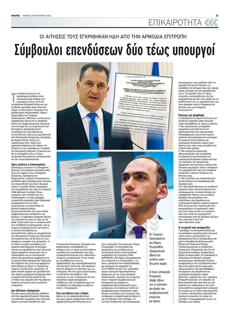The report by Politis, which revealed the first private business activities of Giorgos Lakkotrypis, was published on 24 October 2020 and also referred to former Minister of Finance Harris Georgiades.