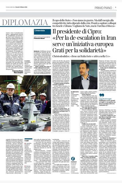 In Brussels for the Spring European Council summit, President Nikos Christodoulides spoke with Corriere della Sera's Francesca Basso about the war in the Middle East and the loan to Ukraine, while voicing Cyprus’ readiness to host talks between Lebanon and Israel. Below is an informal translation of the interview.