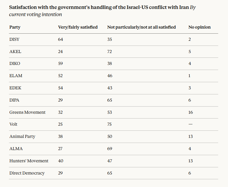Overall, 43% expressed satisfaction with the Christodoulidis government's handling of the Middle East war, while 52% said they were not particularly satisfied or not satisfied at all. Among party supporters, those expressing satisfaction include 64% of DISY voters, 59% of DIKO, 54% of EDEK and 52% of ELAM. Dissatisfaction is highest among AKEL voters at 72%, DIPA and Direct Democracy both at 65%, Volt at 75%, ALMA at 69% and the Greens at 53%.