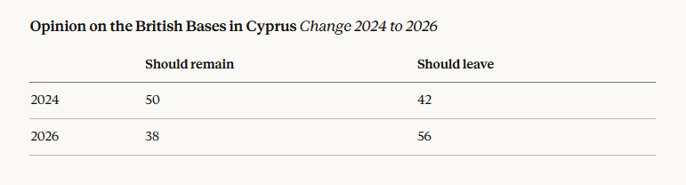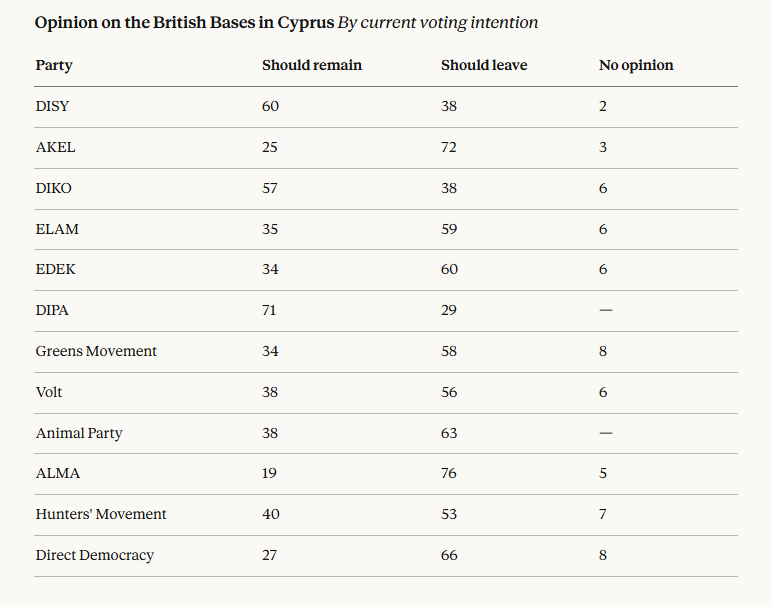 A majority of 56% of respondents said the British Bases should leave Cyprus, while 38% believe they should remain. Support for keeping the bases is strongest among DISY voters at 60%, DIKO at 57% and DIPA at 71%. Those calling for their removal include 72% of AKEL voters, 76% of ALMA, 66% of Direct Democracy, 59% of ELAM, 60% of EDEK, 58% of the Greens and 56% of Volt voters. Some 62% support the doctrine of a unified defence space between Greece and Cyprus, while only 12% oppose it. A further 19% remain neutral and 7% expressed no opinion.