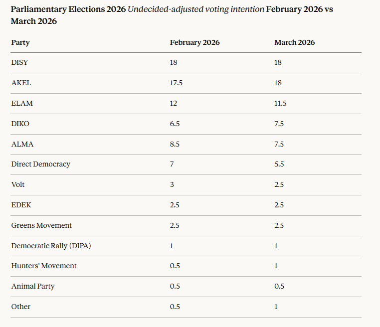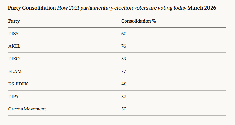 DISY and AKEL are both at 18% in voting intention, followed by ELAM at 11.5%. DIKO and ALMA are fighting hard for fourth place, each on 7.5%. Direct Democracy stands at 5.5%, with Volt, EDEK and the Greens Movement each on 2.5%. DIPA and the Hunters' Movement are both at 1%. Undecided voters account for 7%, while 5.5% say they will abstain, 1.5% intend to cast a blank or spoiled ballot and 7% did not respond. ELAM records the highest voter consolidation at 77%, followed closely by AKEL at 76%, while DISY reaches 60%. DIKO stands at 59%, the Greens at 50% and EDEK at 48%. DIPA trails at 37%.