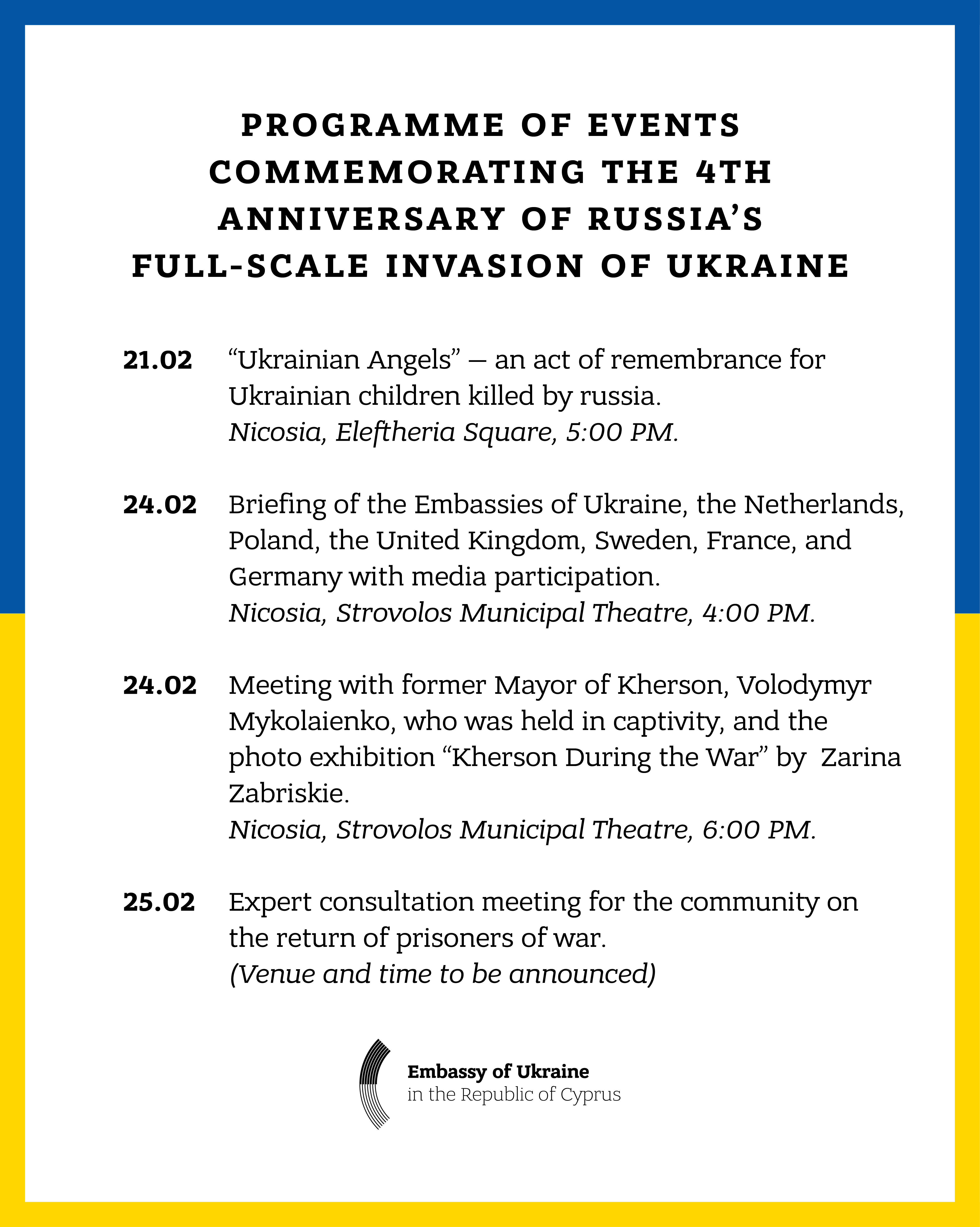 From 21 to 26 February, the Embassy of Ukraine in Nicosia is hosting a Memorial Week to honour victims of the war and civilians who lived under occupation. This is the first time such an event has been organised in Europe in collaboration with 15 embassies: the UK, Netherlands, Poland, Sweden, France, Germany, Japan, the US, and the Czech Republic.