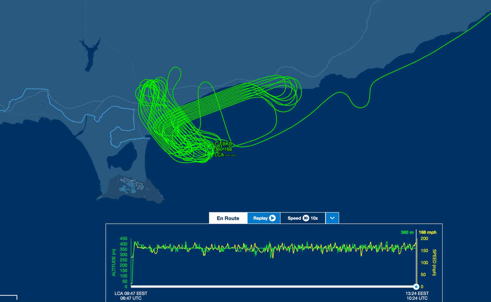 According to recorded flight data, the aircraft took off from Larnaca Airport at 9:47 a.m. and was up in the air for several hours, at an altitude of 360 metres with a speed of 167 mph.
