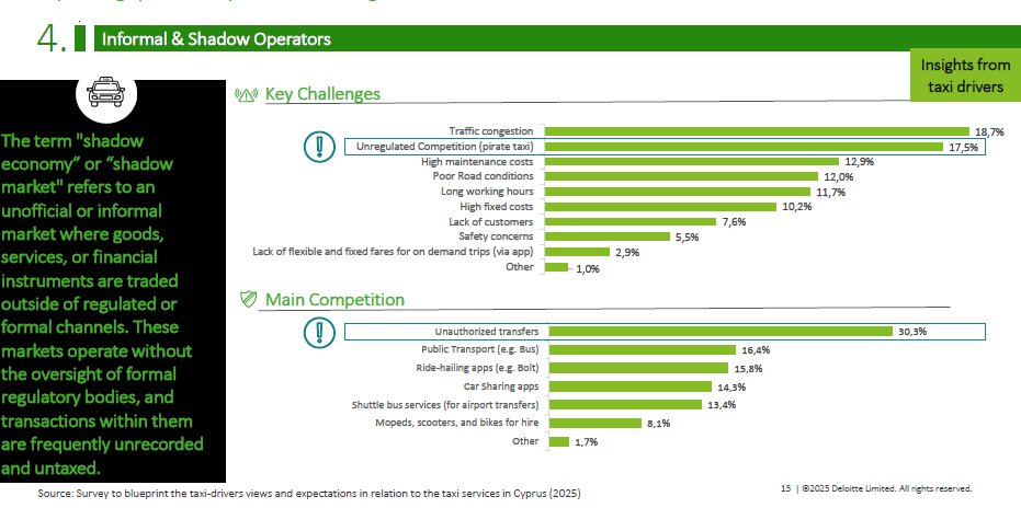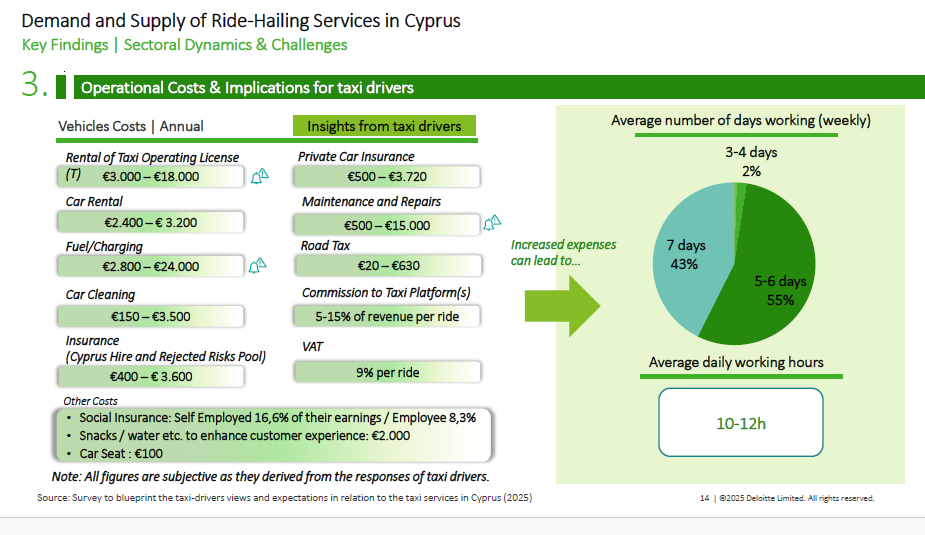 Inconsistent pricing erodes trust. As one Nicosia resident put it: “At 4 pm a ride from A to B cost €10; at 6 pm, the return cost €20.” Reform aims to deliver transparent fares, safer vehicles and reliable service.