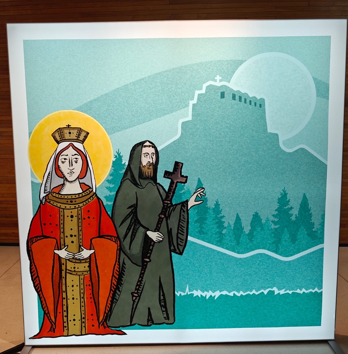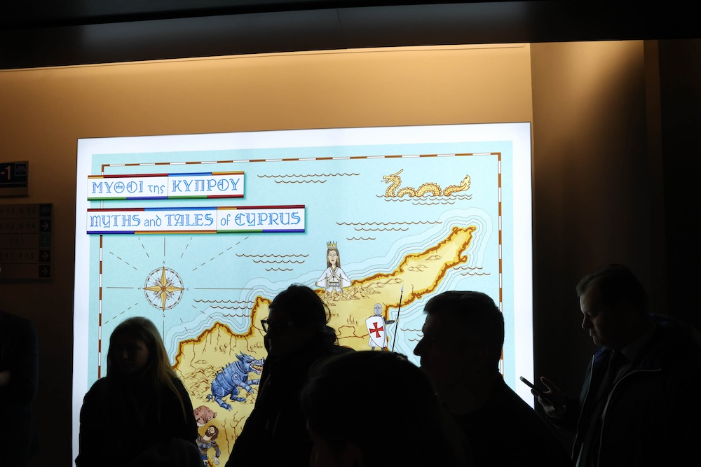 The display features eight well‑known Cypriot myths, including the Dragons, the Knights’ Wine, the Stones of Digenis, Saint Helena and the Holy Cross, Sierolotta, the Flood, Adonis and the Castles of the Queen. These stories were selected as emblematic expressions of Cypriot cultural heritage.