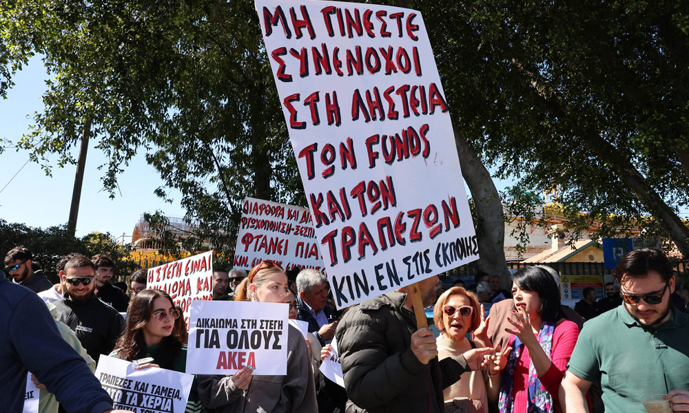 Speakers at the protest accused banks and credit-acquiring companies of unfair practices, arguing that loans sold at low prices are still being pursued in full from borrowers.