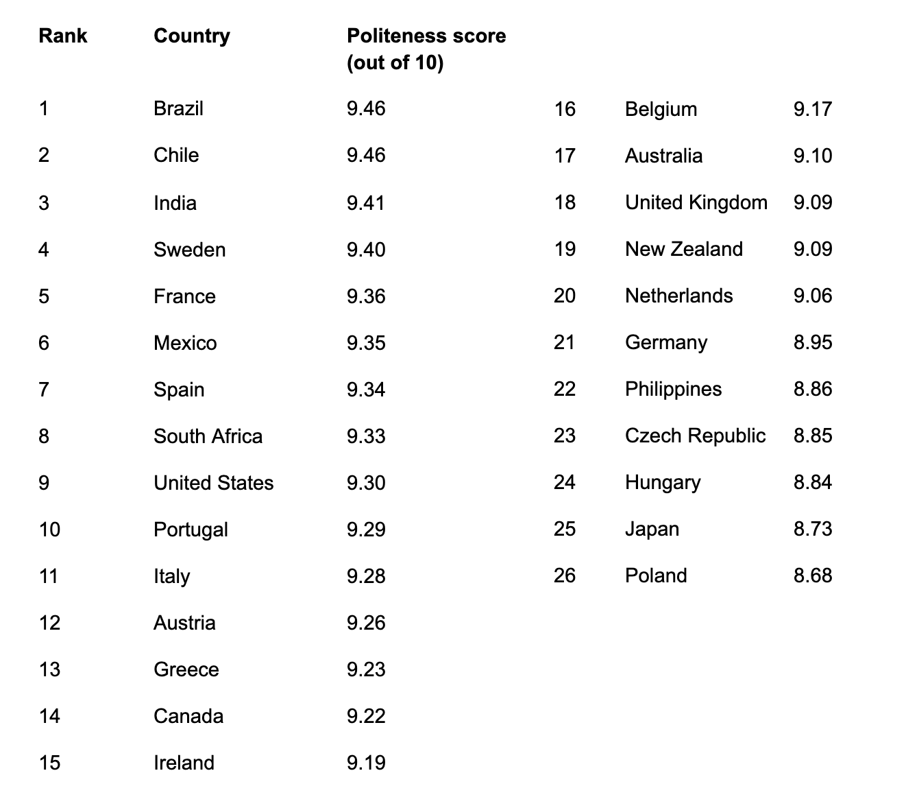 Japan presents the most striking contrast. Although it tops the global rankings for politeness, its respondents ranked themselves 25th out of 26 countries, one of the lowest self-assessments recorded.