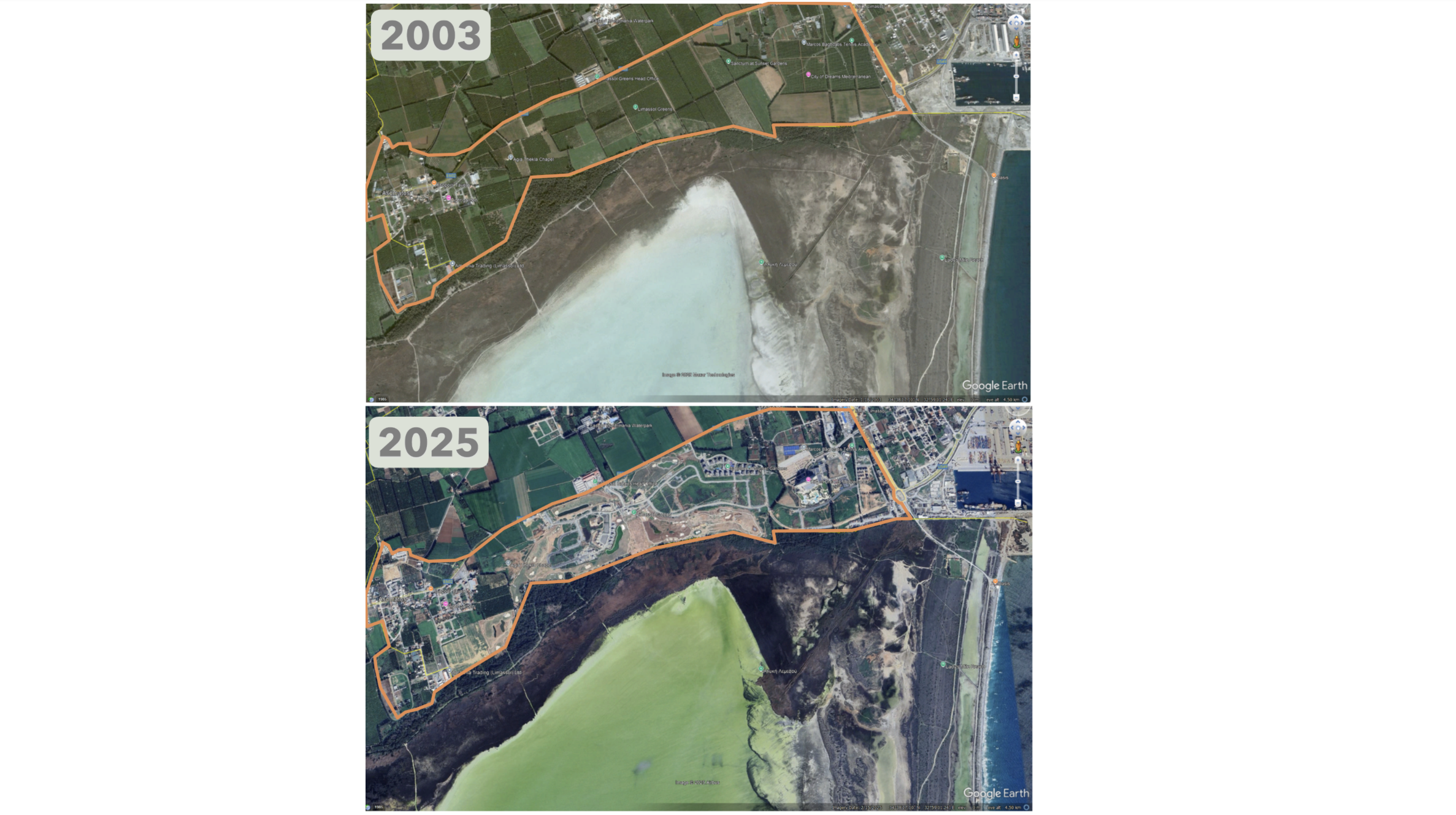 Water quality measurements indicated elevated concentrations of E. coli in some areas. Meanwhile, the flamingo population has plummeted to historic lows. In January 2025, only around 30 flamingos were recorded at Akrotiri Salt Lake, the lowest since systematic counts began in 1992, compared with an annual average of approximately 3,800 birds.