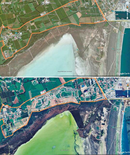 BirdLife recently published satellite images that illustrate the scale of the landscape transformation. In 2003 the area north of the lake was mostly agricultural land with citrus groves and long rows of trees. In 2025 it has become one of the fastest growing districts of Limassol, shaped by the mall, the casino resort, the golf course and extensive residential development.