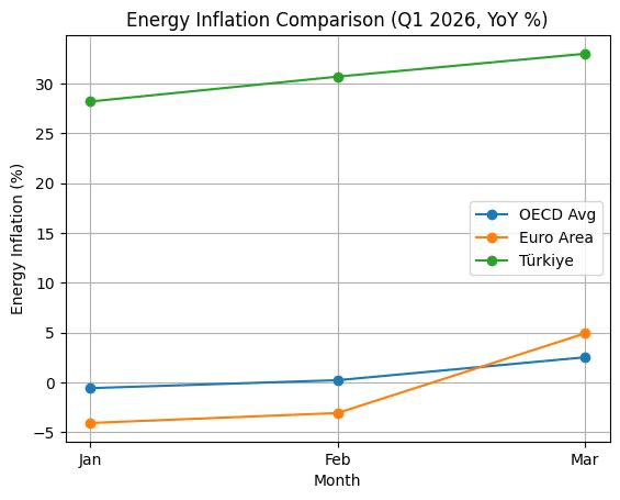 Türkiye presents a fundamentally different picture. Even before the latest escalation, inflation dynamics in the country had already diverged sharply from OECD norms. Energy inflation stood at approximately 28 percent in January, compared to the OECD average of -0.6 percent. Headline inflation exceeded 30 percent in February, nearly ten times the OECD average.