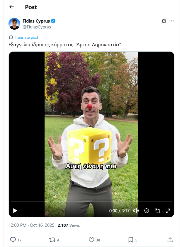 Cyprus’ independent Member of the European Parliament (MEP) Fidias Panayiotou announced on Wednesday the launch of a new party called Direct Democracy. In a video post on social media, Panayiotou – sporting a clown’s red nose – described the news as “the biggest announcement of my life”.