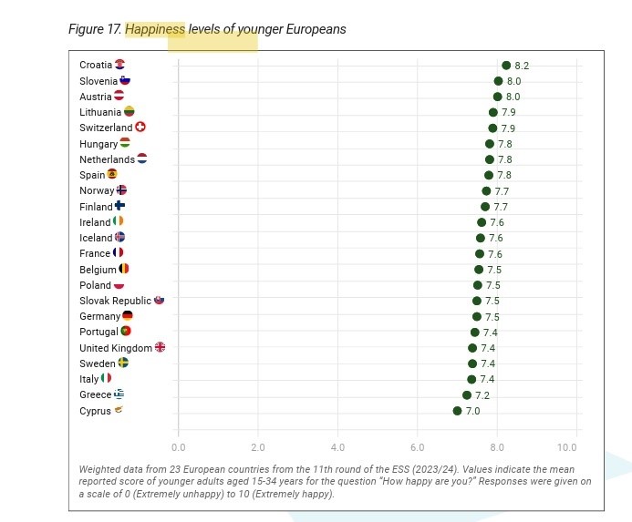 At the other end, Central and Northern European countries showed the highest happiness levels among youth. Croatia topped the list with 8.2, followed by Austria and Slovenia (8.0). The Netherlands, Hungary (7.8) and Switzerland (7.9) also scored above the European average, highlighting the link between well-being, social cohesion and job stability.